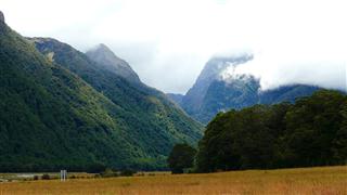 The Fiordland road followed the edge of Lake Te Anau for the first 30km before turning up the Eglinton River valley, slowly rising up to 'The Divide' at 480m. The valley floor was broad and flat with grass and beech forest and the low Fiordland cloud would lift every so often to show the towering sides with some patches of snow still in the shaded valleys.