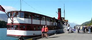 The steam boat TSS Earnslaw departed from the wharf at 10-00am, with us and our bikes on it. It was a delightful restored boat with a steel hull, lots of wood and brass fittings. The main deck was given over to a lounge, cafe and bar. A young pianist tickled the ivories of a baby grand piano, (you could even buy a copy of his sing along CDs).