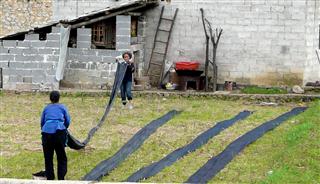 Once up at 1,300m the road went through flat open valleys between the steep sided conical Guizhou mountains and lots of small villages. We saw women spreading out lengths of indigo dyed cloth to dry in the sun. The women's head ware changed from tartan scarves to strips of white cloth wound round the head many times to form a 'polo mint' type of hat. The morning's slow climb was arduous and our average speed was only 9kph.