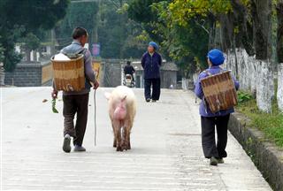 For most of the morning we were slowly climbing up into the Guizhou mountains. Initially the slopes were wooded but as we got higher the terrain was more barren with bare stone and grasses. We rode through Ceyang, Guizhou and it was Sunday market. Among the goods for sale were rows of young pigs being sold for fattening. They were lined up on the pavement, all wrapped in wicker baskets, with no room to move. They were very distressed and squealing. Further along the road was this, more pampered pig, strolling along the road.