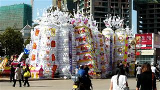 At least it was warm and sunny and mostly downhill. Luliang is close to an Air Force Base and low flying jets flew over our heads as we approached. The road into the town was lined with stone masons carving grave stones out of pale grey rock. We rode a couple of circuits round the town looking for a hotel near the centre but could only find old, grubby ones. There was something going on in the town square, masses of flowers and these large paper and flower creations. We ended up riding back out to the edge of town to book into the big Tong Le Hotel, apparently the best in the area.