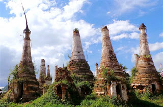 outskirts of this village is a large group of ruined stupas, covered in foliage and with their umbrella tops leaning at crazy angles. We tried to avoid paying the entry fee for the Shwe Inn Thein Temple by cycling up the lane at the side.