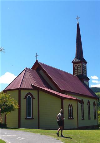 Mount RuapehuThe descent took us through pine clad hillsides to join the SH4 to Wanganui. We stopped in the lovely little village by the side of the river, Upokongaro which has a church with an unusual three sided spire. It has the strange appearance of looking twisted from whichever angle it is viewed.