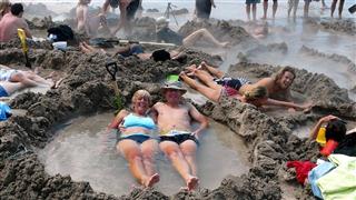 This is one of the Coromandel's and New Zealand's most visited beaches, where for two hours either side of low tide, an area of sand is uncovered where hot water bubbles up from two springs (Maori and Orua) below the surface. Traditionally people take a spade and dig themselves a spa pool. The water can get up to 64 deg C.