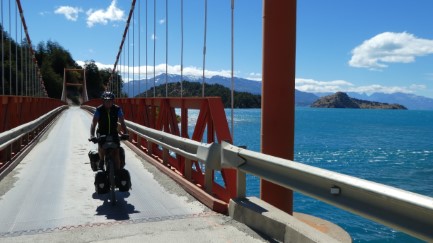 Dusty roadA little further south, we crossed over the bridge between the enormous Lago General Correra and the smaller Largo Bertrand and started climbing to another watershed. Then there was a long, smooth descent into Puerto Bertrand and a small campsite on the lake edge.